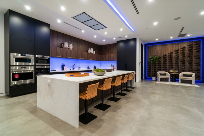 A sky-lit great room with oversize windows and accent walls anchors the home, and a floating staircase ascends to the dining room and kitchen. The nearly 2,000-square-foot floor plan also holds an office, primary suite with wood ceilings and bonus room decked out with a baseball scoreboard.